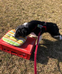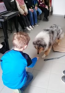Das Thema war Begleit- und Assistenzhunde, v a in Altenheimen. Als „Senioren“ warfen die Kinder Kuscheltiere, die die Hunde zurück brachten, sie bürsteten ihr Fell und versteckten Leckerlis, und sie hoben ihre Füße an, um sich die Socken ausziehen zu lassen. Dies alles unterstützt die Mobilität und Feinmotorik der Senioren. Natürlich kam auch ausführliches Streicheln nicht zu kurz.